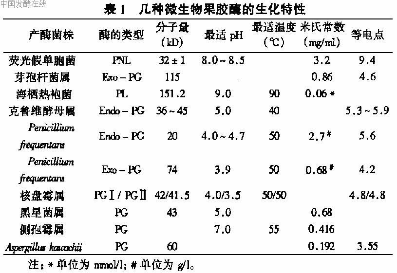 国内外科学家利用层析、电泳等手段对果胶酶的酶学性质进行了研究,明确了一些果胶酶的分子量、动力学性质及其影响因素。常用果胶酶纯化方法有:硫酸铵沉淀、丙酮沉淀、离子交换层析以及凝胶过滤色谱等。果胶酶分子量一般在20kD~60kD之间,单体存在,个别以多聚体形式存在,如海栖热袍菌果胶酸裂解酶分子量为115.2kD,结构为四聚体。通常果胶酶活性范围在pH3.0~9.0,等电点pH4.0~9.0。其中,最适pH4.0~6.5的为水解酶,其作用不需要Ca2+参与。而裂解酶的作用需要Ca2+参与,最适pH为8.0~10.0。不同菌种所产果胶酶性质有所不同。Alana等人[18]采用了半固体和液体发酵两种不同的培养方式,采取凝胶过滤色谱和层析聚焦两种生化手段对Penicillium italicum生产果胶酶进行研究,发现两种培养方式产生的酶分子量、等电点、Km都相同,分别为22kD、8.6、3.2mg/ml。最适作用温度