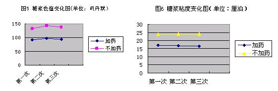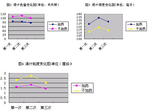 实验连续进行3d,每d同时做加TKSE蔗糖生物助剂和不加助剂的对比试验各一次,实验结果见图2~6。从图2~6中看出加入TKSE蔗糖生物助剂,清汁和糖浆品质都有较大程度的改善,其中清汁色值下降22.7%、清度提高12.2%、粘度减少33.3%,并且沉降时间明显缩短,泥层减薄;糖浆色值下降31.9%,粘度减少30%。