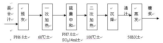 室内实验模拟生产流程在糖厂化验室进行,混合汁取自压榨车间,流程和工艺条件如图1所示:
