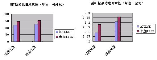 自投加TKSE后,可观察到的变化是白砂糖质量稳步提高,其中白砂糖色值由原来的150IU左右降低并稳定在120IU左右,糖浆泡沫明显减少,泡沫层变薄变细腻。由沉淀池清汁筛面可看到澄清汁泡沫明显减少,而滤清汁泡沫增多,这说明通过TKSE作用,沉淀池内非糖分的分配已发生了明显变化,即进入泥汁的比例增多而停留在澄清汁内的比例减少了。据岗位职工反映,各段糖膏粘度下降,母液中糖分吸收更快,尤其是乙糖膏显得比过去好煮。甲膏分蜜对比的三天中有8个编号的甲膏采取了混筛措施,而试验的三天,只有1个编号的甲膏进行了混筛,而且还不是色值原因。从统计数据看,甲膏结晶率有明显提高。