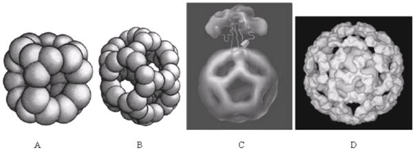 图1 A:原核PDC的E2六面体结构核心框架图; B:真核PDC的E2十二面体结构核心框架图; C:E1三体结合上E2结构核心框架图; D:PDC的E1全部结合上E2结构核心框架图。