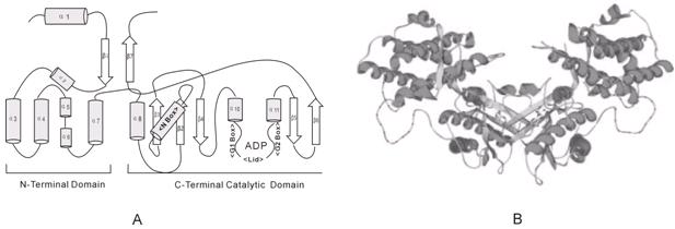 图4: A:PDK单体的二级结构图。 B:PDK二聚体图,青色部分代表α螺旋,黄色部分代表β折叠。
