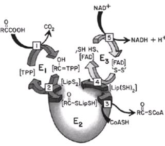 图3 1:E1在TPP与Mg2+的作用下催化丙酮酸脱羧,形成羟乙基-TPP; 2:羟乙基-TPP被移到E2,E2在硫辛酸的作用下催化氧化羟乙基成乙酰基,乙酰基结合上硫辛酸形成乙酰硫辛酰胺; 3:E2催化乙酰硫辛酰胺上的乙酰基转移给CoA形成乙酰CoA; 4:E3把还原型的硫辛酸氧化形成氧化型的硫辛酸,并生成FADH2; 5:在E3的作用下FADH2使NAD+还原,形成循环。