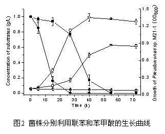 以联苯或苯甲酸作为唯一碳源,培养基配方同前,接种量10%(v/v),空白对照有两种:一种为加菌不加底物,另一种为细菌灭活后加底物。取样时间为(小时)0,5,15,27,40,55,72。每个样品平行三份。菌株降解联苯样品的细菌浓度测定方法为:过滤除掉未利用完的联苯,然后利用分光光度计测量过滤液在600纳米波长处的吸光值;菌株降解联苯样品的底物浓度测定方法为:由于联苯不溶于水,所以利用氯仿整瓶萃取反应液,然后利用HPLC对萃取液中的联苯含量进行测定。菌株降解苯甲酸样品可以直接利用分光光度计测菌浓度,样品取样后除掉细菌和蛋白后直接用HPLC测苯甲酸浓度。