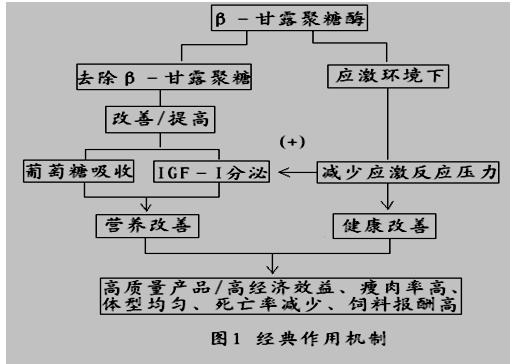 β-甘露聚糖酶在图1的两种机制下,可有效地改进猪与家禽等单胃动物的生长性能。特别是在应激条件下,β-甘露聚糖酶可使其生长性能显著改善。一般认为胰岛素样生长因子((IGF-I)是畜禽真正的生长调控因子。生长激素(GH)的促生长作用是IGF-I介导的。IGF-I作用于生长组织,刺激细胞对氨基酸的利用从而促进蛋白质的合成,抑制蛋白质的分解,最终导致蛋白质的净增长。由图1可见β-甘露聚糖酶对动物生产性能改善的作用机制。其抗病防病的作用机制有二:一是β-甘露聚糖酶可以直接作用于肠黏膜,切断肠上皮细胞与病原菌的结合点,即碳水化合物核心基座、蛋白质和蛋白糖;二是β-甘露聚糖酶的反应产物为甘露寡糖,甘露寡糖可以竞争性地与某些病原菌结合,从而减少了这些有害菌与肠粘膜上皮细胞的联接,进而减少了发病的机率,达到防病抗病和治病的目的。