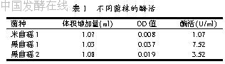从实验室保存的2株黑曲霉、1株米曲霉中分别分离到50株单菌落,经过反复筛选得到3株酶活较高的菌株,其酶活情况见表1。