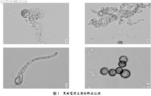 从图1中可以看出,供试菌株的原生质体和其它许多常见丝状真菌一样,可以从菌丝顶端和其它部位释放。在菌丝顶端和其它部位均同时出现菌丝膨大变形情况。这说明细胞壁已被水解掉,细胞膜凸出将要成为原生质体。原生质体释放时,通常是在菌丝的释放部位先膨大形成1个小球体,然后该球体逐渐增大,最后脱离菌丝,有的还可以在原有的释放部位紧接着又形成一个或几个原生质体。释放的原生质体多呈球形,大小不一。