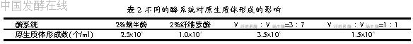 由于真菌的细胞壁组成比较复杂,由外向内依次是不定形的葡聚糖层、糖蛋白层、蛋白质层、几丁质层。用不同的酶系统制备原生质体的结果见表2。