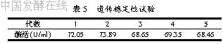 将经原生质体诱变筛选出的高产菌株黑曲霉UV-1连续传代5次,测其酶活,见表5。从表5中可以看出,黑曲霉UV-1的遗传性状基本稳定。