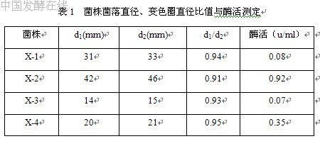 经初筛得到4株能分解木质素的菌株,对其进行变色圈检测及酶活测定。对初筛得到的4株菌采用复筛培养基C进行摇瓶复筛,结果见表1,显示X-2菌株酶活较高,将其作为下一步研究的出发菌株。