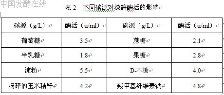 碳源是构成菌体的碳架及能量的来源,真菌细胞干质量的一半是由碳水化合物组成的。碳源在真菌生长过程中占有很重要的地位。试验考察了碳源对X-2生长的影响,改变初始培养基中碳源的种类,所用浓度都为2 g/L,结果见表2。单糖及双糖产酶效果都不是太好,其中最高的为D-木糖,但总体说,单糖没有多糖的效果好。而多糖中淀粉的效果最好,值得注意的是粉碎的是玉米秸秆产漆酶能力相对比较高,又由于其价格低廉,具有较好的使用价值。