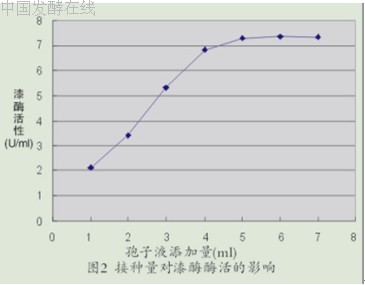 本试验通过筛选得到一株产漆酶的菌株X-2,并研究了其相产漆酶的相关条件,其中菌体所需的碳源当中,除木糖外单双糖的效果都不好,而多糖的效果较好,淀粉为碳源的最高可达到5.5 U/mL,值得注意的是以粉碎的玉米秸秆为碳源的发酵液漆酶酶活也很高。氮源当中无机氮和有机氮均有较高的酶活表现,有机氮源中蛋白胨的产漆酶量最高,可达5.0 U/mL,无机氮源中NH4Cl的产漆酶量最高,可达5.3 U/mL,考虑到无机氮便宜并且氮的含量容易计量,所以氮源采用NH4Cl。在研究碳源、氮源对微生物制备漆酶影响的报道中,结论常常不同,本研究结果与其他研究结果也不同,这是由于不同研究所用的菌种不同,不同菌种对营养要求不同,并且次生代谢产物形成的特点也不相同。本试验表明,漆酶的最佳培养条件为:采用120mL/250mL三角瓶装液量,5%的接种量,培养温度28℃,起始pH为5。最佳培养条件使大量获得漆酶成为可能,并且为进一步纯化漆酶以及研究漆酶性质奠定了基础。