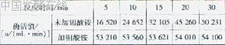 5 min后已基本完全反应,酶活力值已基本接近指标规定范围[≥50 000 u/(mL·min)];而未经催化反应的酶活力测试值随着时间变化,呈现显著的递增趋势,至30 min左右时才基本接近指标值,说明反应未完全。因而试验中加入钼酸铵作催化剂,有利于反应的进行,提高效率,减小试验误差。