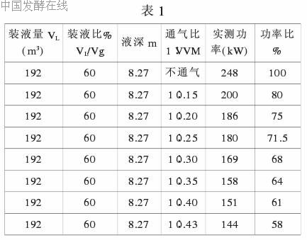 用公称容积Vg=320m3氨基酸发酵罐进行测试。罐内为园蛇形冷却管,加全档板;下中档为涡轮,上档为轴流式组合型搅拌器;搅速1.8r/s;叶径(d)与罐径(D)之比:d/D=0.24~0.3。装液量为罐容积之60%即192m3,以水为介质,按1∶0.15-1∶0.43范围内之通气比进行试验,测定搅拌电机功率,测定结果参见表1。