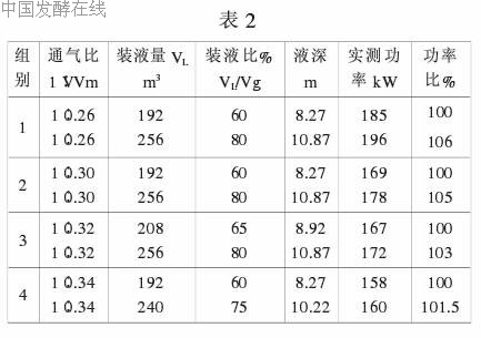 从表2可以看出,通气比相同,装液量(液深)高者,功率有所增加,但提高幅度不大。装液量(液深)相对增加25%~30%,搅拌功率只提高1%~5%。通气比越大,功率提高的越小。总的来看,在通气比较高的条件下,装液量增加对搅拌功率的影响不很大。