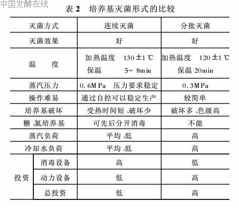 培养基的灭菌消毒目前采用连续灭菌和分批灭菌两种工艺,某些生产厂认为分批灭菌比连续灭菌工艺安全可靠,因而在100米3以上发酵罐的培养基灭菌也不采用连续灭菌工艺。我们认为这要对连续消毒的工艺、装备和仪表进行精心的设计和管理,以上的耽心是多余的,连续灭菌消毒工艺对培养基有效成份破坏少,动力的高峰负荷大幅度降低。因而节约了基建投资和改善了日常运行的平稳性。从设计角度推荐50米3以上发酵罐的培养基消毒采用连续灭菌工艺,中小型发酵罐则可采用分批灭菌工艺(即俗称实消工艺)。