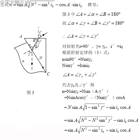 实验中常用直角三棱镜(已知N的介质)进行测量。如图(2)掠射光线由待测折射率为n的介质入射到折射率为N的直角三棱镜ABC中,产生折射临界角rc,然后以出射角i0射入折射率为1的空气中。所有入射角小于90°光线入射到三棱镜ABC中时,其折射角都小于rc,而从三棱镜AB边射出时,其出射角都大于i0。故在棱镜上侧光线出射处放一望远镜,则具有不同出射角的平行光线都会聚在望远镜焦面的不同位置上。当望远镜筒轴线与出射角为i0的光线平行时,从目镜中可以看到半边是明区和半边是暗区,并在明暗区间有一条分界线的现象,即“半影视场”。此时望远镜与AB表面的垂线间的夹角即为出射角i0,因为i0与临界角rc间有一定关系,将此关系代入(2)式并加以整理(见附1)得: