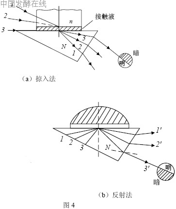 测量固体样品时,若样品透明,则将样品的一个抛光面与折射棱镜(3)并合,其间加一层折射率介于样品与阿贝棱镜之间的接触液(一般为α—溴代荼nD=1.6626)。而样品的另一边不需抛光,就可以进行测读见图4(a),当样品不透明或仅有一个抛光面时,则应用反射法测量,如图4(b)所示:样品与折射棱镜(3)之间,同样需要加入接触液层。
