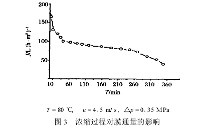 由图 3 可知 ,膜浓缩过程中 ,膜通量随浓缩倍数的增加 ,不断下降。浓缩 8 倍之后 ,膜通量下降很快。