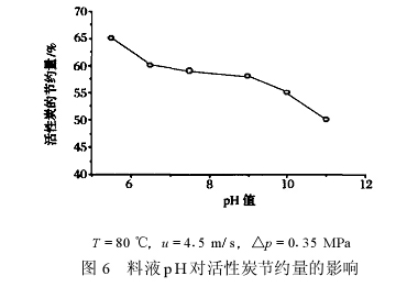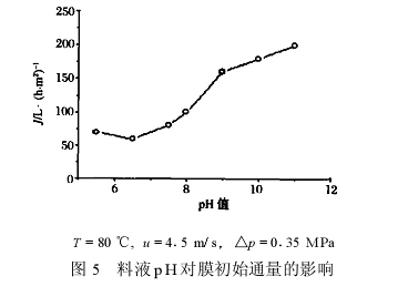 加 ,其渗透液所用活性炭的节约量就会减少。当 pH值大于 9 时 ,活性炭的节约量低于 50 %;但当 pH 值在 6~9 时 ,因蛋白分子之间的静电斥力很小 ,容易团聚 ,杂质会较容易聚集在膜表面。这其间 ,活性炭的节约量下降也稍微平缓。通过 pH 值对膜通量及杂质去除率情况的分析 ,料液的 pH 控制在 9 左右比较合适。