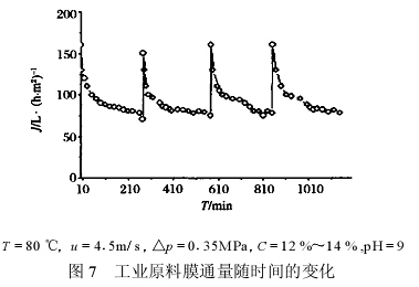 从图 7 来看 ,在与小试同样的操作条件下 ,料液的平均通量为 80~90 L/ (h·m 2) 。而且重复性较好。