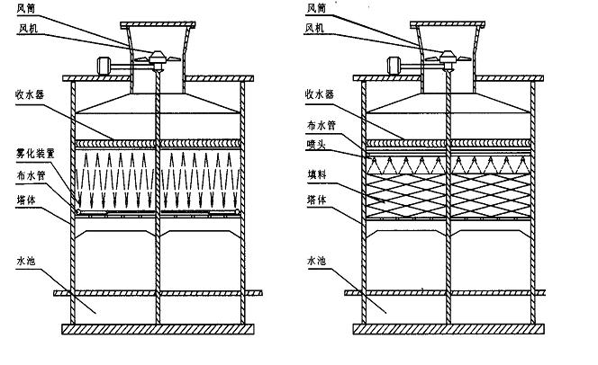 无填料喷雾冷却塔的结构如图1a ,填料喷雾冷却塔结构如图1b。