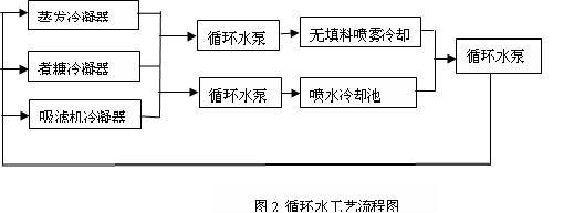 在甘蔗制糖过程中, 要用去大量的水,特别是蒸发、煮糖产生的汁汽冷凝冷却用水。据统计, 目前国内糖厂每处理吨甘蔗与耗水量之比约为1∶18~ 32, 其中有80% 以上为冷凝冷却用水。随着糖厂生产规模的不断扩大, 加上水源污染越来越严重, 水资源的供需矛盾日益尖锐, 而随着水法及环境保护法的实施,制糖企业的环保意识逐步提高。因此,糖厂中大都采用了冷凝冷却水循环使用的方式, 提高水循环利用率,达到减少取水量及污水排放量的目的。