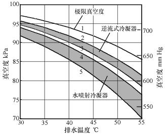 干式冷凝系统采用逆流喷淋冷凝器配合水环式真空泵,理论上,系统排气温度可以达到进水温度(即常说的“干式真空”),因此可以达到更高的真空度。与湿式冷凝系统相比,其排水温度可以提高至接近蒸汽温度(在同样的真空度下),(如图1[1])耗水量大为降低。同时,水环式真空泵抽气效率要比水喷射泵高。