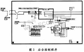 首先是对串口的初始化设置:波特率为默认值9600,8位数据位,1位停止位,无校验位,串口号为3。当系统开启时,通过VISA Write.vi向单片机发送“发送请求命令”由于LabVIEW的串行通信子VI只允许对字符串的读写,因此在数据处理时,必须进行字符串与数字之间的正确转换,在这里通过调用1个“组串”子VI实现此转换。在收到上位机的发送请求命令后,单片机则进入中断发送所采集的数据,上位机通过 VISA Read.vi节点读取单片机送来的数据,并且判断是否收到4位来控制Case结构中的是执行False还是执行True。这里使用Case结构是为了避免单片机的丢位现象发生。如果有丢位现象发生,则执行True读取前面所读到的数据。如果没有丢位现象发生,则执行False读取数据。由于采用12位的SARADC将标准的模拟信号(电流,电压)转换为数字信号,因此需要用2个字节来表示1个数据。这里采用1个子vi来进行转换。读完1个数据,用实时趋势图控件Wave-form Chart显示完后执行下一个循环。图3给出了上位机对单片机进行读、写操作的框图程序。