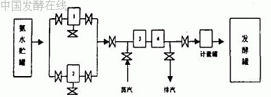 在一些抗生素品种的发酵生产过程中,氨水是作为一种调节发酵液pH 值和补充氮源的重要物质。氨水在发酵过程中是通过氨水专用管道随进风不断地通入发酵罐内的。而抗生素发酵过程大多是一个纯种培养的过程,也就是说,只能允许抗生素产生菌在发酵罐内进行生长代谢,而不允许其它杂菌在发酵罐内生长,一旦杂菌滋生,将严重地影响抗生素发酵单位和产品质量,因此进入发酵罐内的任何物质都必须保持无菌,进入罐内的氨水同样也必须保证无菌,这就要求对所用的氨水加以处理以达到无菌的要求。