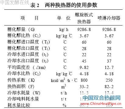 从表2 可以看出, 使用螺旋板式换热器不仅可以节省换热面积, 节约投资, 而且可以大大节约冷却水, 其用水量仅为喷淋冷却器的6512 % , 以3000t/年淀粉酒精厂为例, 按年生产300 天计, 每年可以节约用水量43920t 。同时, 由于螺旋板式换热器结构紧凑, 其占地面积仅为喷淋冷却器的十分之一, 可使车间设备布置更加合理紧凑。