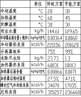 3 两工艺方案举例计算 下面以单台300 M3发酵罐生产空气需求为例,分别计算两工艺方案中净化系统的热负荷,再比较阻力损失减小带来的影响。 3.1 热负荷计算 设空气量V=4500M3/h,空压机进口空气压力P1=0.1MPa(绝压,下同),干球温度T1=36℃,相对湿度φ1=90%,湿含量X1=0.0342kg/kg干空气。出压缩机压力P2=0.4MPa。 设空气冷却分两级,先冷至50℃,后至20℃。经计算:干空气质量流量G=4731.88 kg/h,压缩机出口温度T2=134.73 ℃,50℃时压缩空气(饱和状态)湿含量X1=0.0202 kg/kg干空气,凝结水量W1=66.25 kg/h;再分别计算干空气冷却、水蒸汽冷却和水蒸汽冷凝的热负荷,合计为Q1=140010.8 kcal/h。(具体计算可参考文献[3],下同) 再计算空气冷至20℃时,压缩空气(饱和状态)湿含量X2=0.00364 kg/kg干空气,凝结水量W2=78.36 kg/h;再分别计算干空气冷却、水蒸汽冷却和水蒸汽冷凝的热负荷,合计为Q2=81145.6 kcal/h。 两项合计凝结水量W=144.61 kg/h,热负荷Q" = 221156 kcal/h。而实际使用中,即使冷凝器运行在设计工况,由于一般旋风分离器等除油水设备的效率较低的问题,凝结水不可能完全除尽,将夹带至加热器,增加了加热器热负荷。若加热器面积不够或蒸汽温度、流量低,就会出现加热空气相对湿度达不到过滤器要求,甚至出现游离水油份危害过滤器膜件的情况。 可计算,若分离设备效率按75%计,将有W3=23.73 kg/h的游离水分夹带在空气中,设加热后成60℃湿空气。分别计算干空气加热、水蒸汽加热和水份加热和汽化的热负荷,合计为Q3=60031 kcal/h,其中游离水分的加热和汽化耗能占23.8%。 若采用一次冷却到30℃,并用高效旋击分离器分离冷凝后水分的方案,如上计算,将结果汇总于表一。