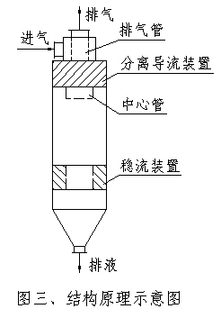 气体从分离器进气口进入,和排气管壁碰撞后往下流动,再和导流装置进行多次碰撞,使细微液雾(滴)和微粒撞击凝聚成大液滴和大颗粒,在导流装置作用下,气流作向下旋转运动,在离心力作用下,液滴(微粒)被分离,而后在稳流装置作用下,被分离后的液滴(微粒)不再飞扬带出,由分离器下部排液管派出,而气流经中心管由排气管排出。 |