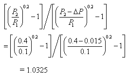 3.2 计算结果分析 3.2.1 湿空气状态分析 从表一可看出,计入分离器效率因素,总体除水效果传统方案要比节能方案差。后者比前者多除水8.77 kg/h,加热器后,空气湿含量后者比前者低18%。为了维持较低的相对湿度,传统方案须采用较高的加热温度,消耗更多的热能。 3.2.2 热负荷分析 比较两个方案总热负荷,后者要比前者低24.9%,约78589 kcal/h。考虑传热损失和能量转换效率等因素,乘系数1.5,计算能耗差可达117884 kcal/h,相当于每天节约404.2 kg标煤(7000 kcal/kg计),按普通煤价500元/吨计,就是202元/天、6.7万元/年(年生产330天计)。 3.2.3 压降计算分析 另外,新工艺因加热器、分离设备的减少和管路的简化,可比传统工艺减少阻力损失0.01MPa-0.02MPa之间,按ΔP=0.015MPa 计算功率比[4]: