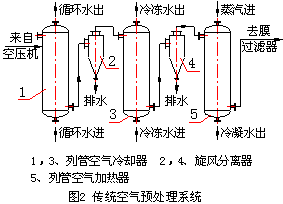 2.2.4冷却加热温差幅度合理 系统运行时冷却、加热的温差幅度以满足最后出口空气相对湿度50%以下为准。既于此,系统采用高效卧式气液分离器能将游离水份除尽,从而使空气冷却、加热温差缩小。冷却器一般夏季也可不用冷冻水,在冬季,压缩机后高温空气也能满足加热器的热源要求,保证膜过滤器安全运行。 传统系统(见图2)与本节能系统的差异很明显。前者一般采用循环水、冷冻水两级冷却,两级除水,然后蒸汽加热的工艺,设备采用普通列管式换热器和旋风分离器。此系统去除游离水效果差、工艺复杂、空气流程曲折,导致阻力损失大;设备效率低,且冷却、加热幅度大,能耗高。 4.总结 4.1 好气性发酵空气系统,是生产的重点,能耗大,节能潜力也较大。而本节能空气预处理系统工艺合理简洁、设备效率高。正符合好气性发酵生产节能之要求。 4.2 根据生产应用得出:本节能空气预处理系统在满足发酵稳定生产的同时,节能效果显著。有利于节约资源和提高企业经济效益,值得在发酵行业推广应用。 参考文献 [1] 于信令,于军等. 氨基酸发酵生产的调空优化[J] . 发酵科技通讯,2006,(35)(1):28-30. [2] 钱颂文. 换热器设计手册[M]. 北京:化学工业出版社,2002:305. [3] 陆飞浩,岑文学等. 好气性发酵的空气净化系统节能探讨[J]. 发酵科技通讯,2005,(34)(4):27-50. | ||