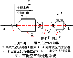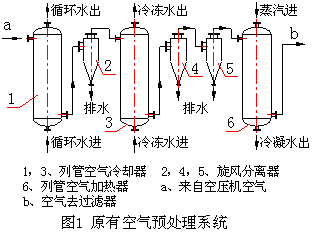 1.1预处理系统流程图 原有空气预处理系统属典型的传统方案(见图1),放置在空压车间。采用循环水和冷冻水两级冷却、三级除水,然后蒸汽加热的工艺,设备采用普通列管换热器和旋风分离器。 1.2存在问题 此系统工艺复杂,空气流程曲折,阻力损失大,约0.05MPa,系统供气量不足无法满足发酵用气要求;特别是旋风分离器分离效率低,一般只有60%~90%,还有10%~40%凝析水份无法分离,不得不采取更低的冷却温度或更高的加热温度,冷却后升温幅度达30℃~40℃,以降低空气相对湿度。由于冷却、加热的幅度大,所以能耗高。而且在雨季或空气潮湿的季节,用气量波动时,旋风分离器分离效率更差,预处理后空气相对湿度大,影响膜过滤器除菌效能,空气带菌现象时有发生,影响生产。
