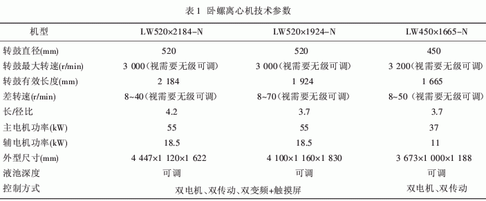卧螺离心机是一种高速回转的沉降式离心机,它 不需要过滤介质,连续自动并具有造型美观,体积小重 量轻占地面积小,处理能力大,能耗低、转速;差转速无 级可调,耐磨保护性能好(螺旋叶片上的耐磨块、转鼓 出渣口的耐磨套可更换),长/径比大,应用范围广等特 点。我公司引进国外技术生产的LW520×2184-N和 LW520×1924-N型离心机,其差速器从国外进口,它的 体积小重量轻且承载能力大,可靠性高。不但电控自动 化程度高,而且在电控系统中有能量回馈设计,比同类 产品节能23%以上。此外,我们还采用完全自主设计的LW450×1665-N卧螺离心机用于玉米、薯干、鲜红 薯酒糟废液分离,取得了同样的良好效果,由此证明卧 螺离心机是酒糟废液分离的理想设备。卧螺离心机结 构与工作原理见图1,卧螺离心机技术参数见表1。
