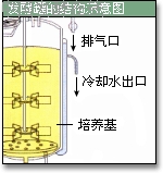 发酵罐是一种圆柱形的容器,容量从几升到几百万升不等,上面连接有通气、搅拌、接种、加料、冷却等装置;此外,还有对温度、pH、通气量与转速等发酵条件进行检测和控制的装置(如图)。