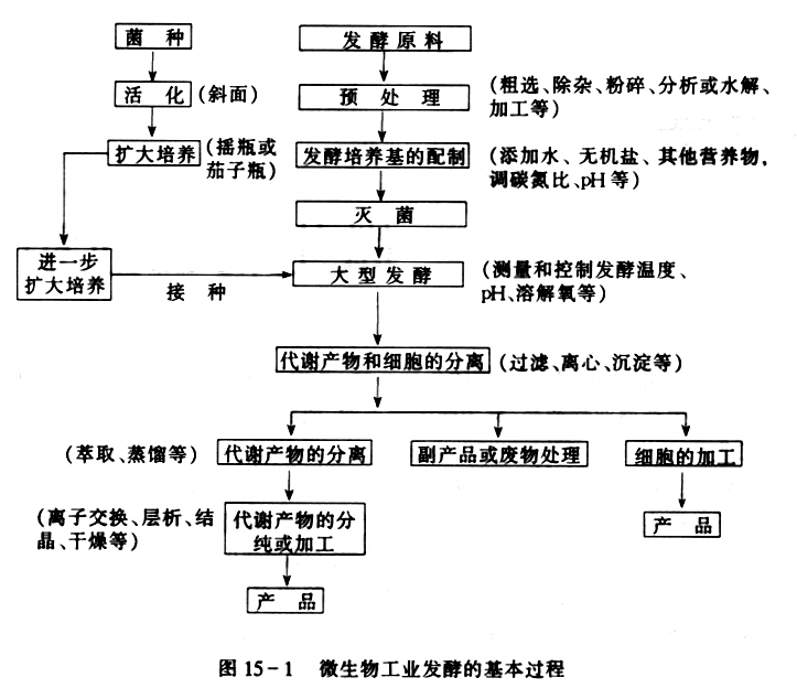 微生物的工业发酵方式有多种多样,但发酵过程是很类似的,其基本步骤如图15-1所示,有的发酵过程更繁多,有的则可省去某些步骤。