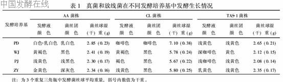 测定结果(表1)表明, AA和CL菌能很好的利用啤酒、味精废水和沼液为主要基质的培养基,发酵培养后产生大量的菌丝团(球),菌丝球黄褐色到黑色、直径大小不等。CL菌在3种废水发酵培养基中生长情况好于AA菌。培养液由发酵前的浑浊状,变成浅黄至金黄色清澈的液体,对废水起到净化作用。TAS-1和HX-0501也能利用3种废水培养基进行发酵培养。HX-0501菌在啤酒、味精废水和沼液培养基中形成大量浑浊状细菌,颜色由乳黄色到浅黄色。TAS-1在上述3种废水培养基中发酵,产生大量细小的放线菌球,菌球乳黄色到浅黄色,发酵液浅黄至金黄色。但井冈霉素菌和阿维菌素菌不能利用啤酒、味精废水和沼液培养基进行发酵培养。