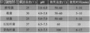 部分菌型生长最适温度、pH及致死温度、致死时间范围表