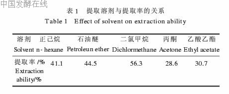 表1表明,二氯甲烷的萃取效果最好,石油醚较好,但考虑到二氯甲烷毒性大,石油醚的价格贵,正己烷的极性小,并考虑到产品溶剂残留问题,溶剂回收等问题,本实验选正己烷作为萃取溶剂。