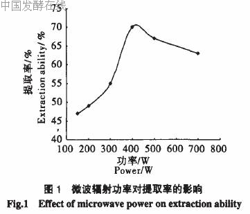 先将三孢布拉霉菌发酵液中得到的三孢布拉霉菌菌丝体进行预处理,具体方法如下:三孢布拉霉菌菌丝体用布氏漏斗进行抽滤,然后以固液比1∶2,加入95%乙醇混合均匀布氏漏斗进行抽滤,所得物料筛成均匀颗粒45℃烘干,最后以固液比1∶1加入丙酮球磨。在不同条件下进行微波提取,然后过滤,提取液适当稀释后用高效液相色谱法测定,最后计算提取率。