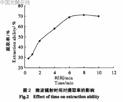 由图2表明,在8 min内提取率明显提高,随着时间延长,提取量增长不大,然后开始下降。原因可能是开始时温度逐渐升高,混合越来越充分,提取量增加,8 min时混合已经很均匀溶剂温度较高,提取量已经较可观,继续延长时间,温度过高,氧化带来的损失明显。