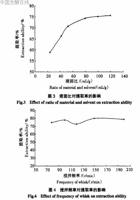 图4可见,搅拌频率大小对提取的效率影响不大,基本上不变,从节省能源方面考虑选择搅拌频率最小78 r/min。