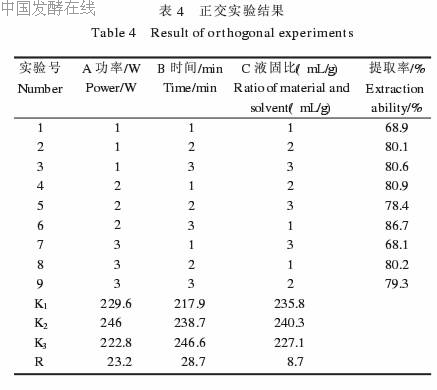 由表4可知,在正交实验的3个因子中,时间对提取率的影响最大,由极差数据R可见,各因子对提取率的影响依次为:提取时间>微波功率>液固比。