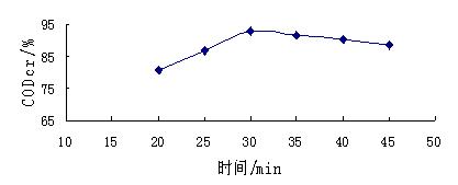 由图4可知,废水PH值在5.0左右时,CODcr的去除率在90%以上,这主要是由于在酸性条件下其离解度小,大分子物质留在水中有利于活性炭的吸附,CODcr的去除率较高。随着PH值增加,大分子物质离解增多,活性炭吸附有机质的量减少,水中的CODcr值增大,去除率下降。因此确定吸附的PH值在5.0左右。