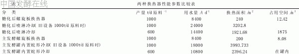 我们选用的螺旋板换热器流道为 20cm, 比原来用的铜管 φ85 流道要大, 以前我们使用的铜管因流道小, 阻力大, 物料 是悬浮液, 易堵塞。使用该螺旋板换热器克服了这一缺点。 随着社会的进步和发展, 能源消耗和环境污染日益严重, 国家对企业的节约能源减少污水排放量的要求也越来越高, 在 酒精生产中, 利用螺旋板换热器, 不仅节约用水, 而且在我们不 断改造的有限的空间里减少了空间的占有量, 设备投入少, 维 修费用低, 因用水量的减少, 使用水泵就少, 节约了用电量。使 用螺旋板换热器, 起到了节能减排降低各项消耗的作用。