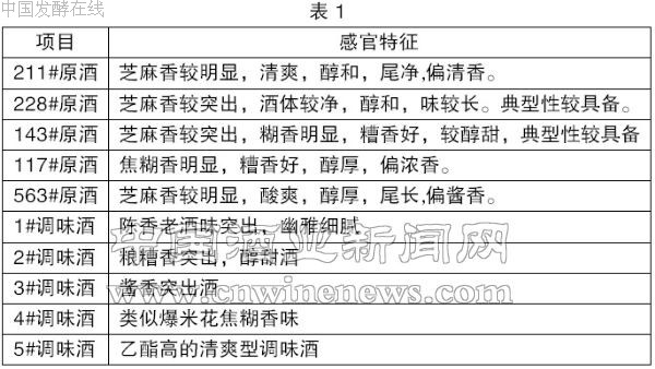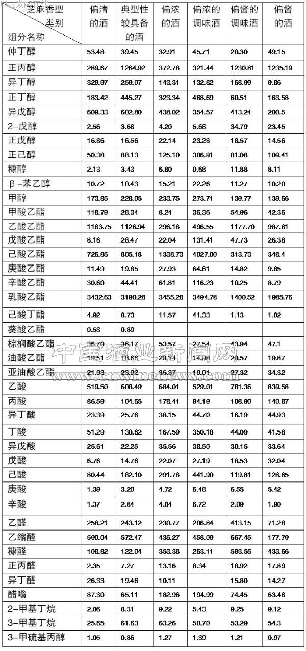 贮存3年以上的各类单样复粮芝麻香型白酒感官特征见表1;各类型酒微量成分指标见表2。