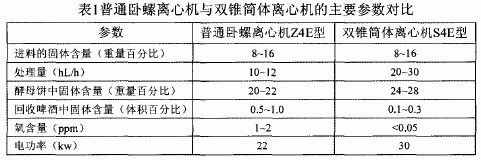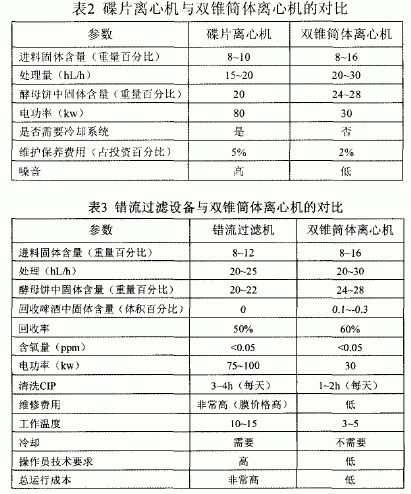 碟片离心机对输入介质的固体含量有一定的限制性要求。由于设备结构的原因,碟片离心机中的酵母饼必须始终是光滑的,具有较高的相对滑动性,否则容易造成碟片离心机的堵塞。出于这些原因的考虑,必须限制碟片离心机进料的含固率。而双锥简体离心机则没有这一条件的限制,因此其啤酒回收效率明显高于碟片离心机。表2中给出了碟片离心机双锥简体离心机一些技术参数的区别。